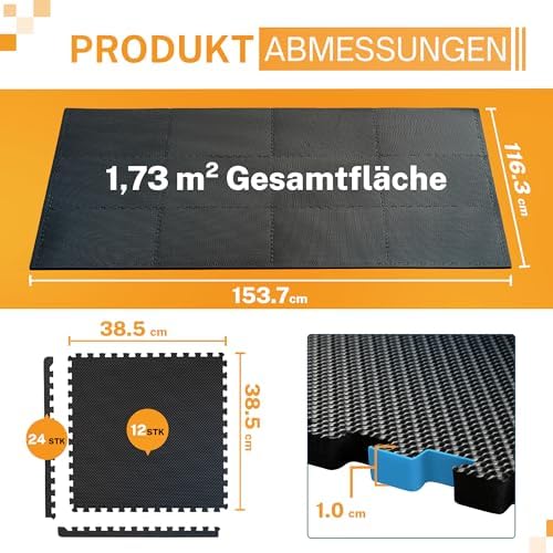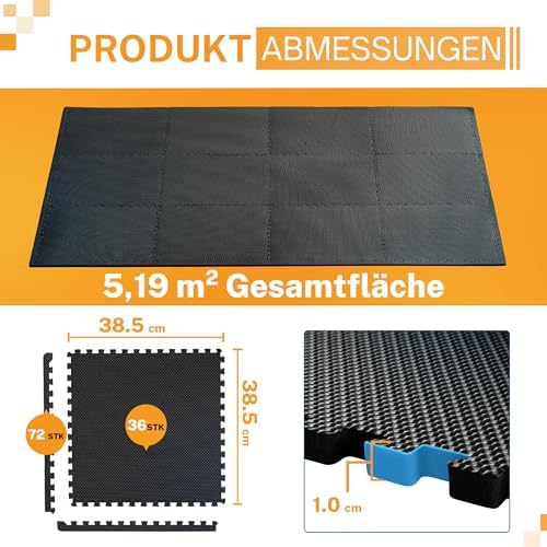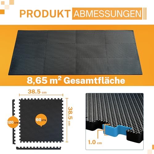 Im Lieferumfang sind 60 Matten enthalten, jede mit den Maßen 40 x 40 x 1,0 cm, inklusive Randstücke. Die Matten sind wasserdicht, wärmeisolierend, schallabsorbierend und stoßdämpfend. Mit ihrer langen Lebensdauer bieten sie Ihnen eine nachhaltige und effektive Lösung für Ihren Trainingsbereich.