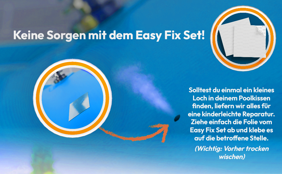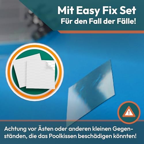 Mit einer beeindruckenden Dicke von 0,4 mm bieten unsere Poolkissen einen zuverlässigen Schutz, der Temperaturen bis zu minus 20 Grad standhält. Dieses Winterschutz-Produkt ist daher der ideale Begleiter selbst in den kältesten Wintern. Falls es dennoch zu einem Materialriss kommt, erhalten Sie direkt ein “Easy fix” Set als Zubehör mit, um eine schnelle Reparatur zu ermöglichen.
